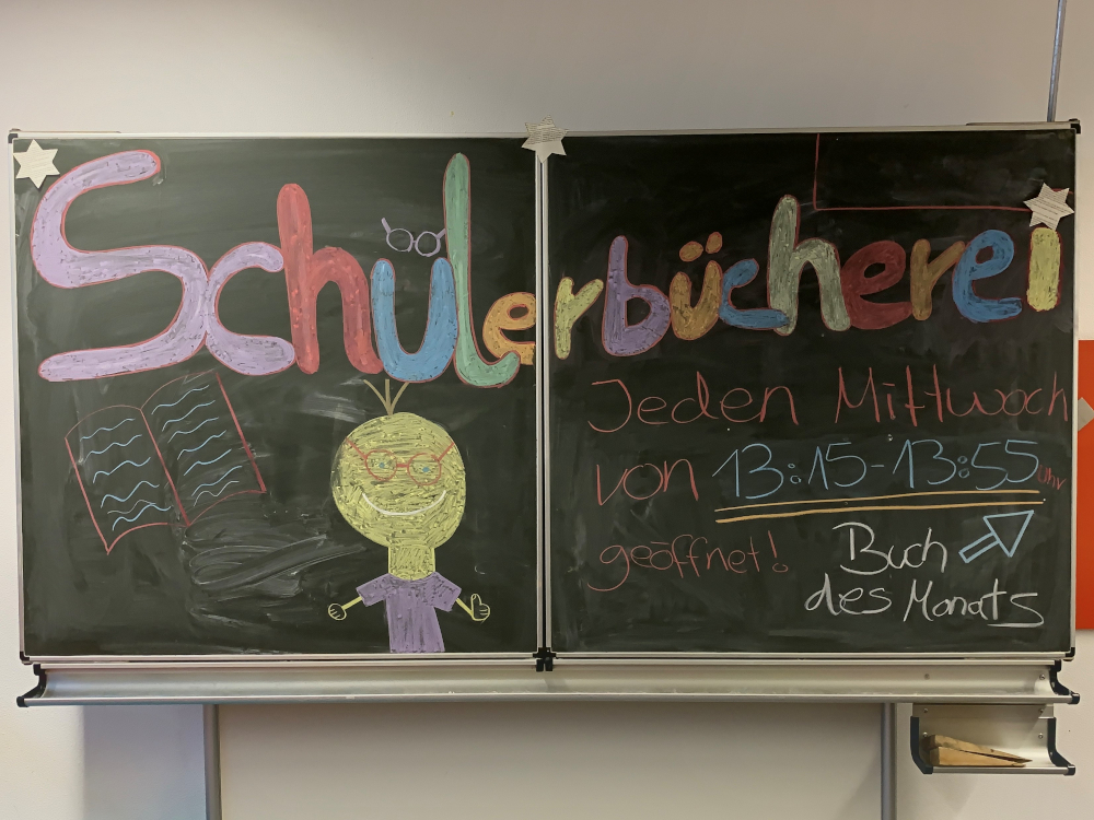 Die Bücherei befindet sich gegenüber vom ARA-Raum und ist montags und mittwochs in der Mittagspause geöffnet. Bei schönem Wetter kann auch im Schulgarten weitergelesen werden.