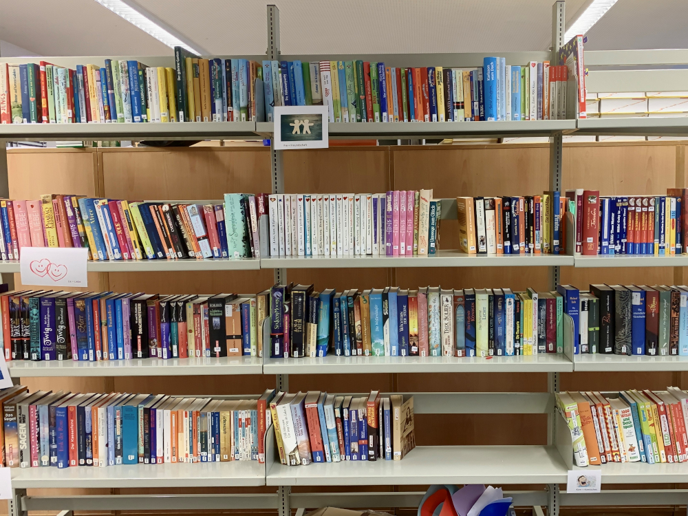 ... ist ein gemütlicher Ort zum Stöbern, Lesen und Entspannen. Schülerinnen und Schüler aus dem Jahrgang 9 kümmern sich engagiert um die Gestaltung und Organisation der Bücherei. Sie haben neue Regale eingeräumt, dekoriert und eine gemütliche Sitzsackecke eingerichtet.