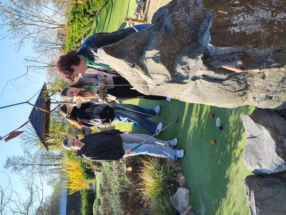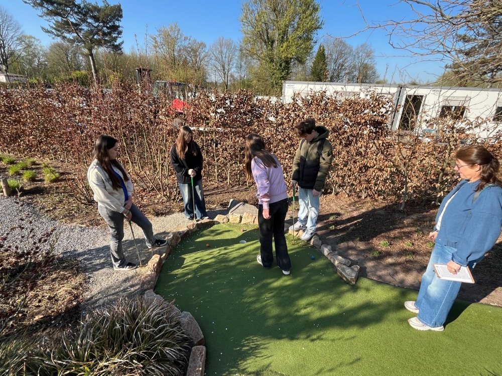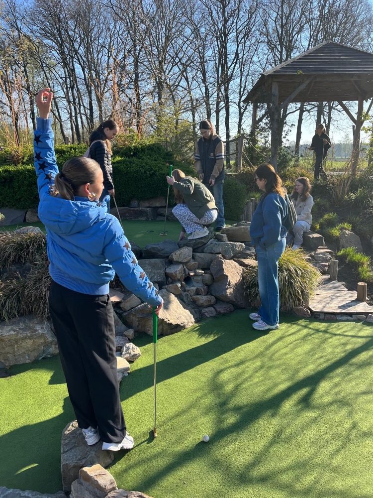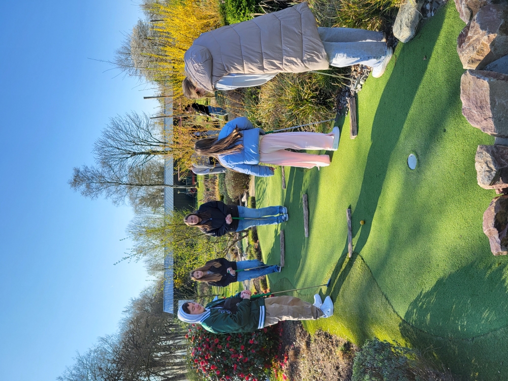 Heute starteten wir den Tag mit einem gemütlichen Frühstück in unseren Gastfamilien, bevor wir uns in Richtung der Stadt Oisterwijk aufmachten. Sie ist bekannt für ihre schöne Natur mit vielen Wäldern und Seen. Unser erstes Ziel war eine Minigolfanlage mit 18 Bahnen. Alle hatten großen Spaß beim Spielen – auch wenn zwischendurch ein paar Bälle in den Büschen verschwanden und gesucht werden mussten. Die gute Laune ließ sich davon niemand verderben, im Gegenteil: Es wurde viel gelacht und angefeuert.