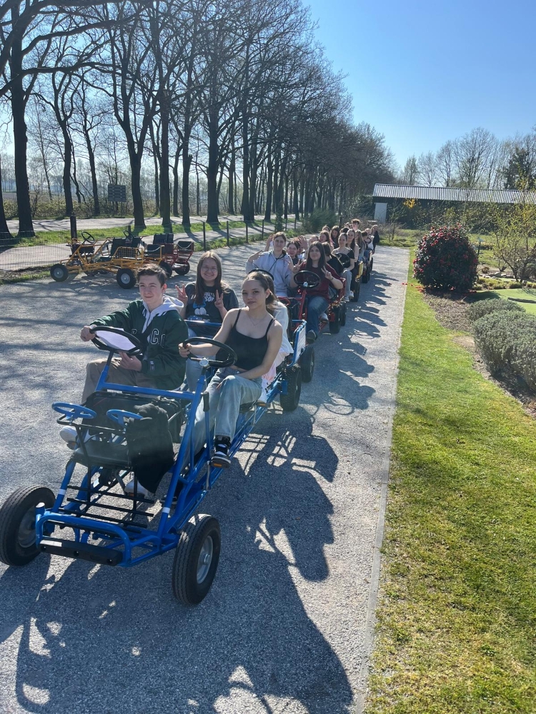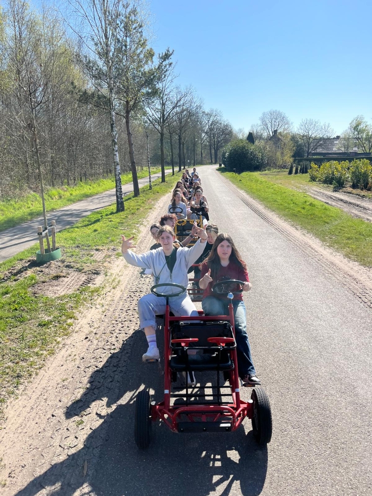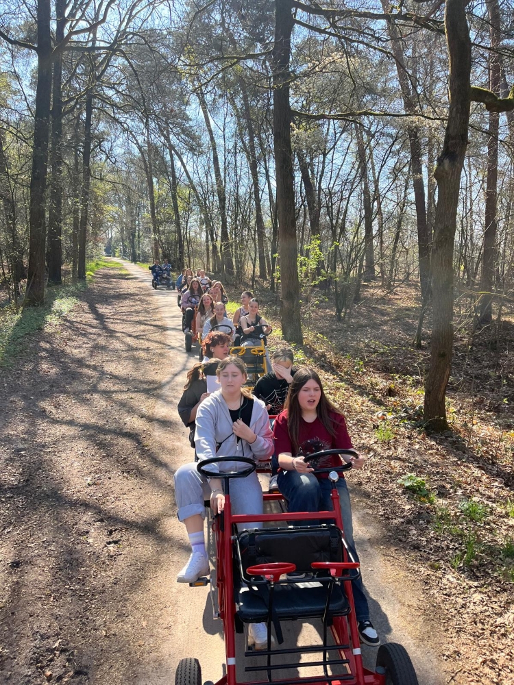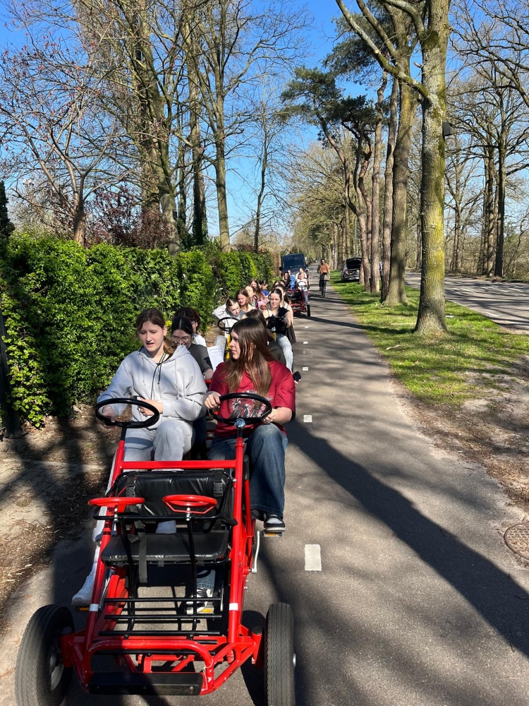 Nach dem Minigolf stiegen wir in Gruppen zu je fünf Personen auf ein sogenanntes „Fietsfiets“ – eine Art Gruppenfahrrad, bei dem vorne zwei und hinten zwei Sitze sind, sowie ein kleiner Platz ganz hinten zum Mitfahren. Die etwa 8 Kilometer lange Fahrt führte uns durch wunderschöne Wälder und an idyllischen Gewässern vorbei. Dabei wurde viel gesungen und gelacht – die Stimmung war ausgelassen und fröhlich.