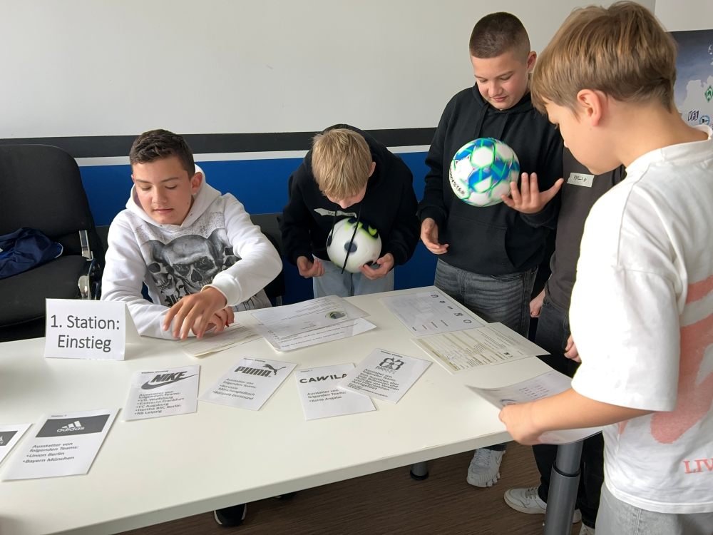 Ein weiterer Programmpunkt war die Produktion von Fußbällen. In Gruppenarbeit recherchierten die Schülerinnen und Schüler verschiedene Bälle – ihren Hersteller, Preis, Verwendungszweck (Trainings- oder Spielball), Material, Produktionsweise (handgenäht oder maschinell gefertigt), Fair-Trade-Zertifizierung und die Entlohnung der Arbeiterinnen und Arbeiter. Dabei kam eine ernüchternde Erkenntnis ans Licht: Die meisten bekannten Fußballvereine arbeiten nicht mit Fair-Trade-Marken zusammen. Immerhin – so lernten die Schülerinnen und Schüler – wird in der Bundesliga mit einem Fair-Trade-Ball gespielt, was zumindest einen kleinen Schritt in Richtung Nachhaltigkeit darstellt.