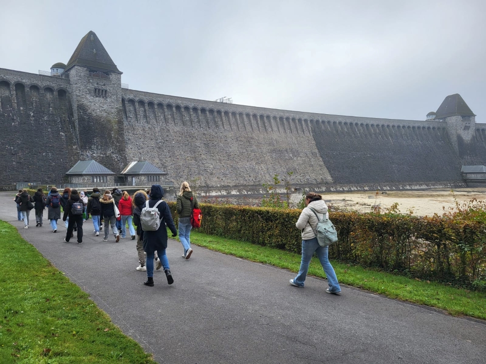Am Mittwoch ging es für uns vom Bahnhof in Geseke nach Soest. Dann sind wir mit zwei Bussen zu unserem Workshop vom Landschaftsinformationszentrum (LiZ) Wasser und Wald Möhnesee gefahren. Gemeinsam sind wir eine Bi-Parcour-App zum Thema Nachhaltigkeit durchlaufen. Anhand praktischer Beispiele haben wir verschiedene Nachhaltigkeitsthemen zu den 17 Sustainable Development Goals der UN bearbeitet. Auf der alten Staumauer am Möhnesee haben wir ein Picknick gemacht. Als Nächstes haben wir eine Schatzsuche gemacht, die im Wald versteckt war. Wir sind dann zur Bogenschießhalle gefahren, wo wir in zwei Gruppen aufgeteilt wurden. Die eine Gruppe durfte Bogen schießen und die andere hat einen riesigen Jenga Turm gebaut. Nach der Rückkehr in Geseke hatten wir noch etwas Freizeit. Abends sind wir alle gemeinsam zum Bowlen gegangen. Das war unser vorletzter Tag des Erasmus + Projekt.
