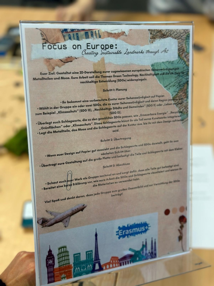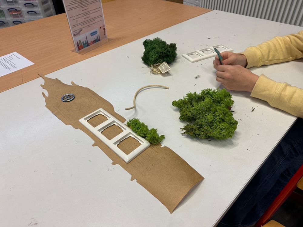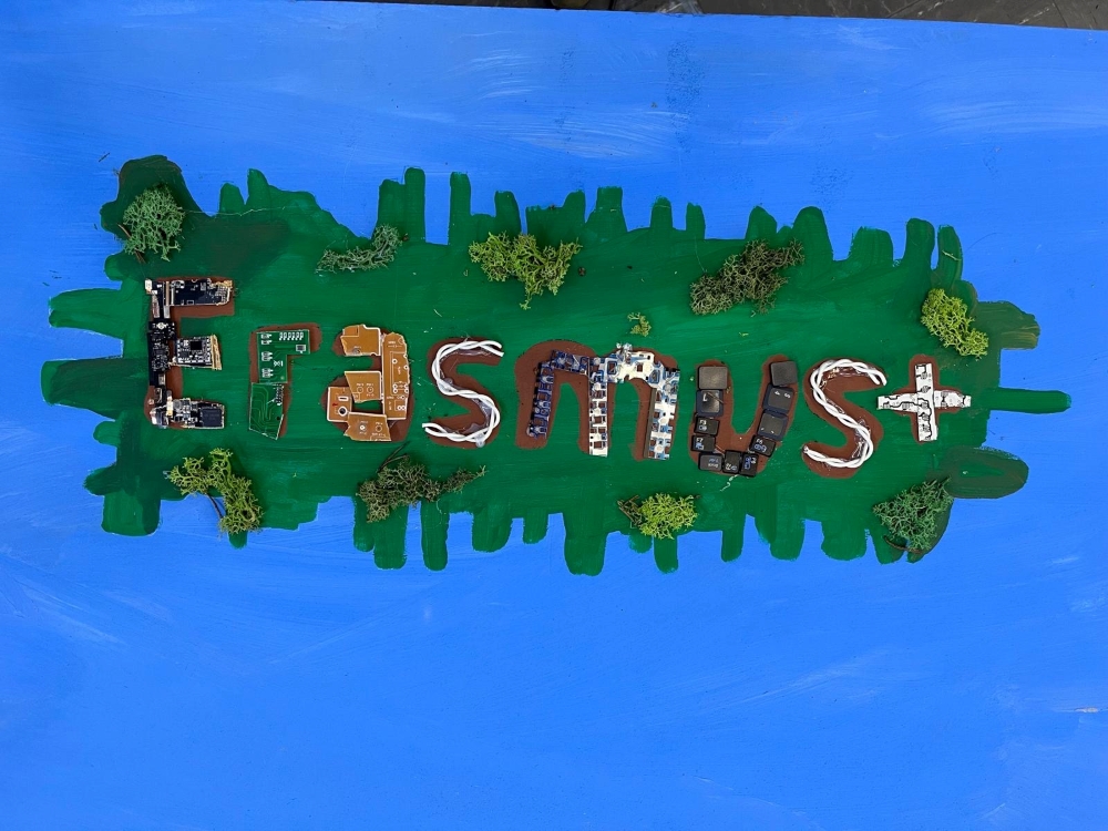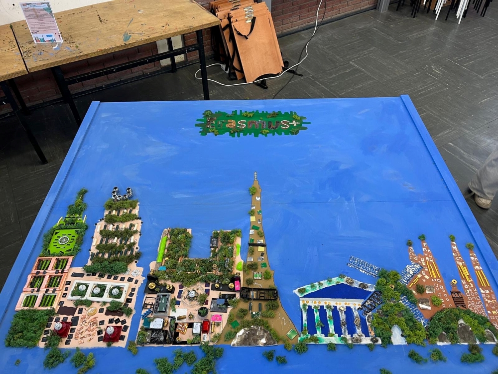 Am Donnerstag waren wir in der Schule. Wir haben uns vor dem Kunstraum getroffen und zuerst mit alten elektronischen Geräten wie einem Laptop, alten Spielzeugen oder Handys Bastelmaterialien für unser Kunstprojekt erstellt. Das Thema unseres Kunstprojekts war "Focus on Europe: Creating Sustainable Landmarks through Art“. Aus Elektroschrott und grünem Islandmoos gestalteten wir kreativ eine Erasmus+ Landschaft mit verschiedenen Sehenswürdigkeiten aus Europa, wie z.B. dem Eiffelturm, dem schiefen Turm von Pisa oder der Akropolis, die noch einmal die Themen der Erasmus+-Woche Green Erasmus/Nachhaltigkeit und neue Technologien darstellte. Nach dem Kunstprojekt hatten wir erstmal eine große Pause. Nach der großen Pause haben wir uns mit Frau Kröger in der Küche getroffen. Frau Kröger hat uns Rezepte typisch deutscher Speisen mitgebracht. Wir bereiteten eine Klößchen-Suppe (mit Brokkoli, Karotten und anderem Gemüse), einen Kartoffelsalat (mit einer Soße aus Skyr und Kräutern) und einen Obst-Salat (mit z.B. Äpfeln, Mandarinen, Bananen) zu. Nach dem Essen um 14 Uhr wurden die Austauschschüler mit dem Bus abgeholt und zurück in die Niederlande gebracht.