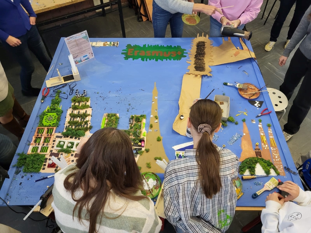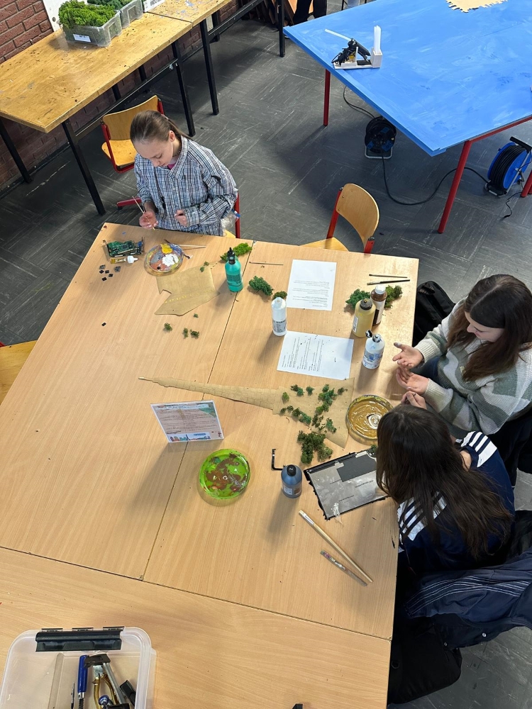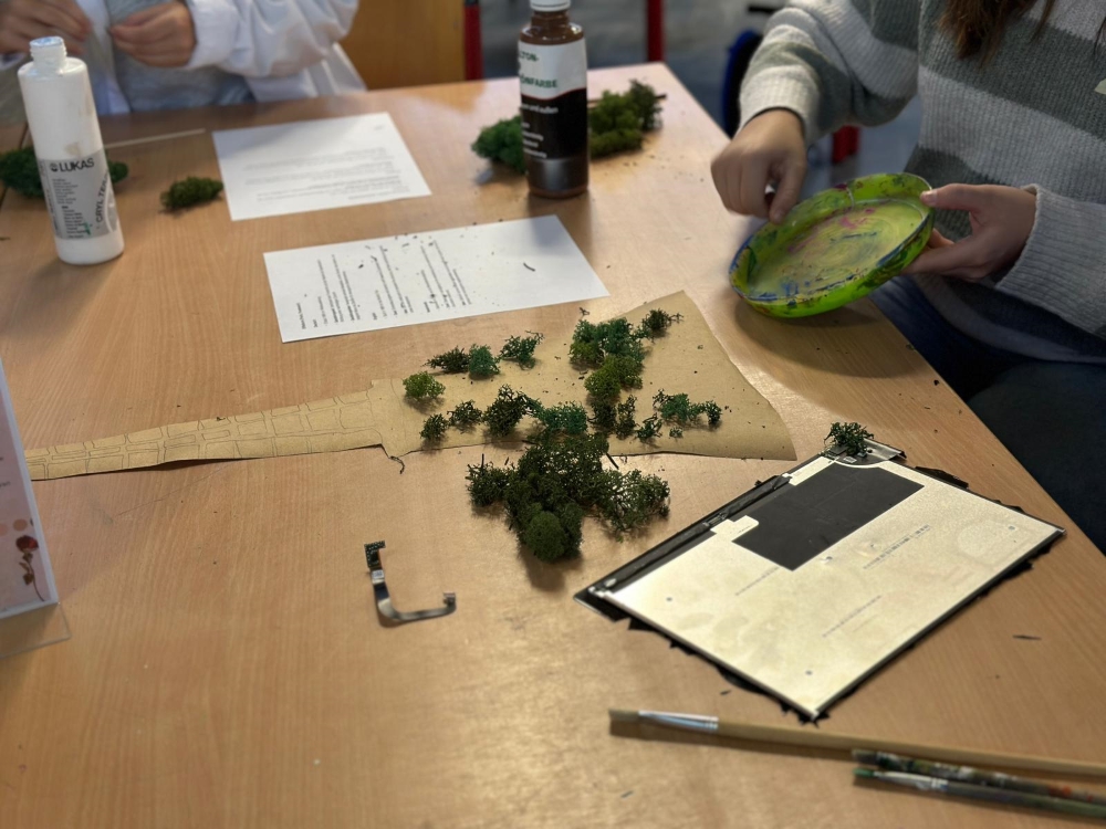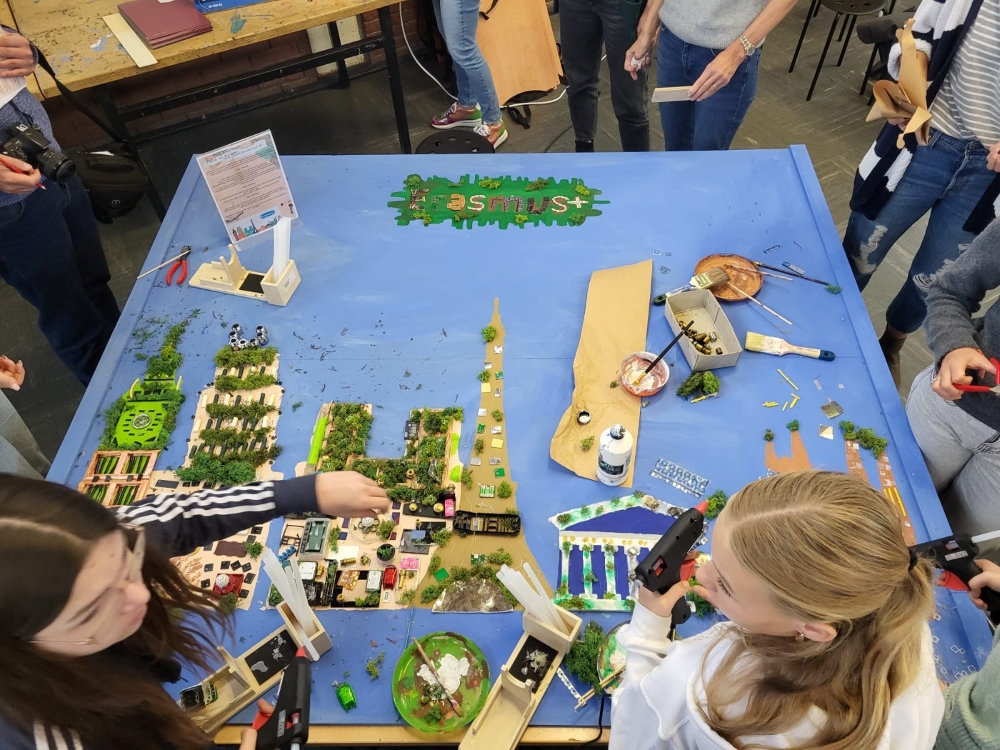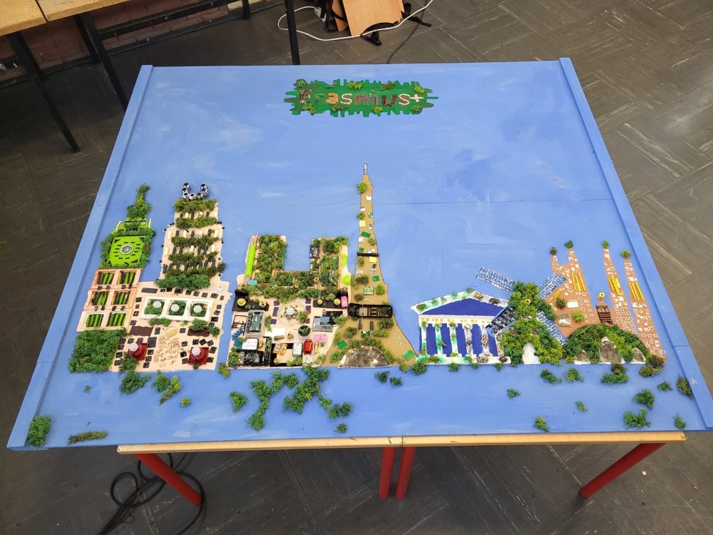 Am Donnerstag waren wir in der Schule. Wir haben uns vor dem Kunstraum getroffen und zuerst mit alten elektronischen Geräten wie einem Laptop, alten Spielzeugen oder Handys Bastelmaterialien für unser Kunstprojekt erstellt. Das Thema unseres Kunstprojekts war "Focus on Europe: Creating Sustainable Landmarks through Art“. Aus Elektroschrott und grünem Islandmoos gestalteten wir kreativ eine Erasmus+ Landschaft mit verschiedenen Sehenswürdigkeiten aus Europa, wie z.B. dem Eiffelturm, dem schiefen Turm von Pisa oder der Akropolis, die noch einmal die Themen der Erasmus+-Woche Green Erasmus/Nachhaltigkeit und neue Technologien darstellte. Nach dem Kunstprojekt hatten wir erstmal eine große Pause. Nach der großen Pause haben wir uns mit Frau Kröger in der Küche getroffen. Frau Kröger hat uns Rezepte typisch deutscher Speisen mitgebracht. Wir bereiteten eine Klößchen-Suppe (mit Brokkoli, Karotten und anderem Gemüse), einen Kartoffelsalat (mit einer Soße aus Skyr und Kräutern) und einen Obst-Salat (mit z.B. Äpfeln, Mandarinen, Bananen) zu. Nach dem Essen um 14 Uhr wurden die Austauschschüler mit dem Bus abgeholt und zurück in die Niederlande gebracht.