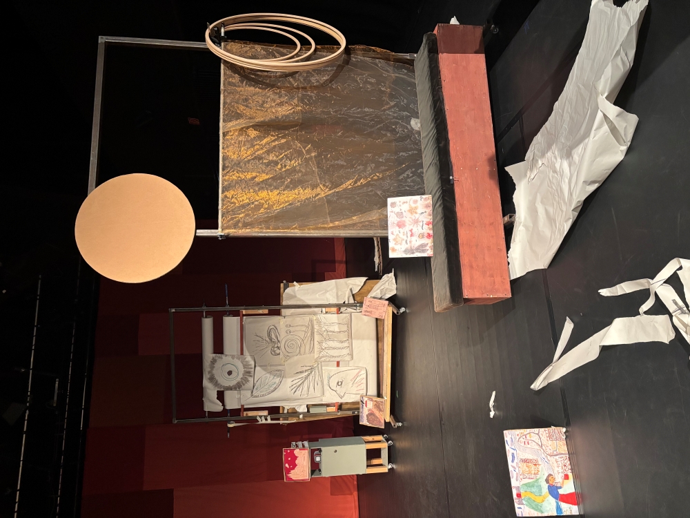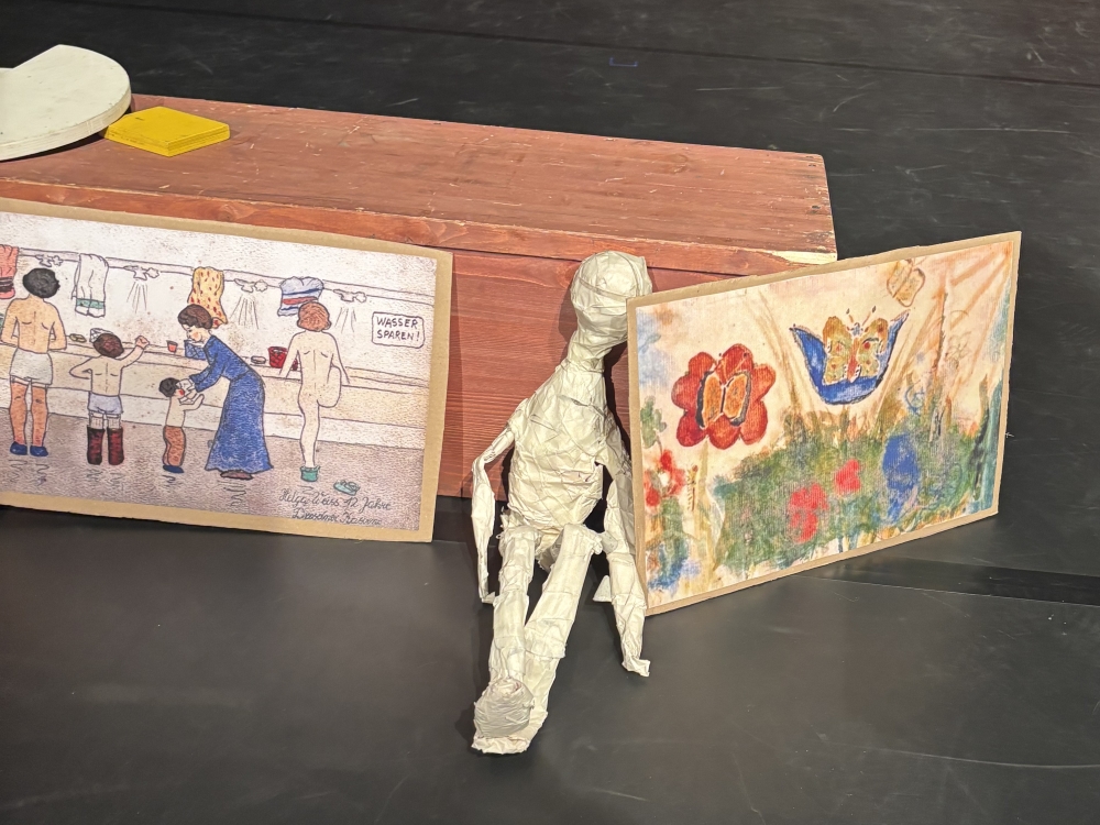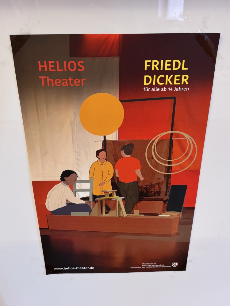 Ein besonderer Höhepunkt des performativen Projekts war der Besuch der Inszenierung „Friedl Dicker“ im HELIOS Theater Hamm am 21. November 2025. Das Stück „Friedl Dicker“ erzählt das Leben der Friedl Dicker — einer vielseitigen, mutigen und kunstbegeisterten Frau, Schauspielerin, Bühnen- und Innenarchitektin, Malerin und Bauhaus-Studentin. Die Inszenierung wählt einen multiperspektivischen Ansatz: Sie lässt drei Schauspielerinnen gleichzeitig agieren — sie verkörpern nicht nur Friedl Dicker, sondern wechseln zwischen Erzählerinnen, Kommentatorinnen und unterschiedlichen Perspektiven, was eine vielschichtige Darstellung ihrer Biografie und ihres Umfelds ermöglicht. Auch die Bühne selbst war Teil der künstlerischen Aussage: Das Bühnenbild greift Elemente der Bauhaus-Ästhetik auf, nutzt bewegliche Materialien, Projektionen und Objekte, wodurch ein Raum mit offenem Charakter entsteht, der ständiges Wechseln und Umgestalten erlaubt. Durch die Authenzität der Materialien war die geschaffene Kulisse sehr eindrucksvoll: Material von Zeitzeug*innen, historische Filmsequenzen und Projektionen verknüpfen das Leben Friedl Dickers mit der Zeit des Nationalsozialismus und machen die Schrecken dieser Epoche im Publikum fühlbar.