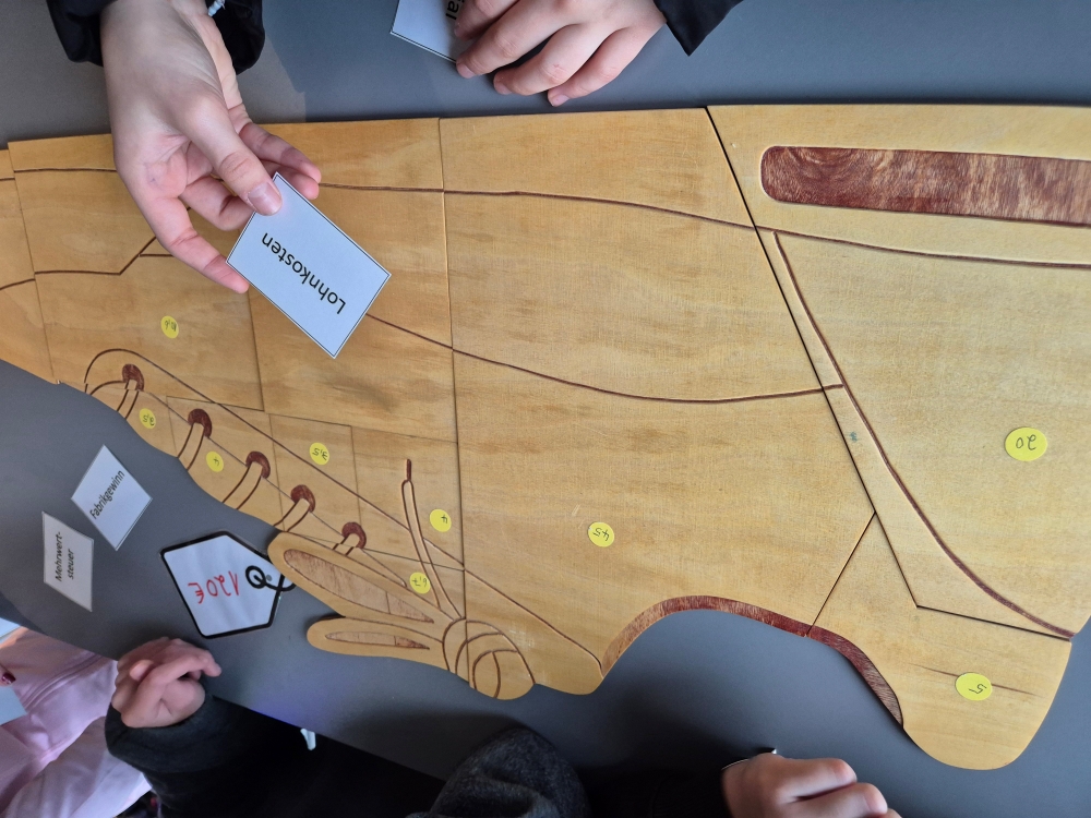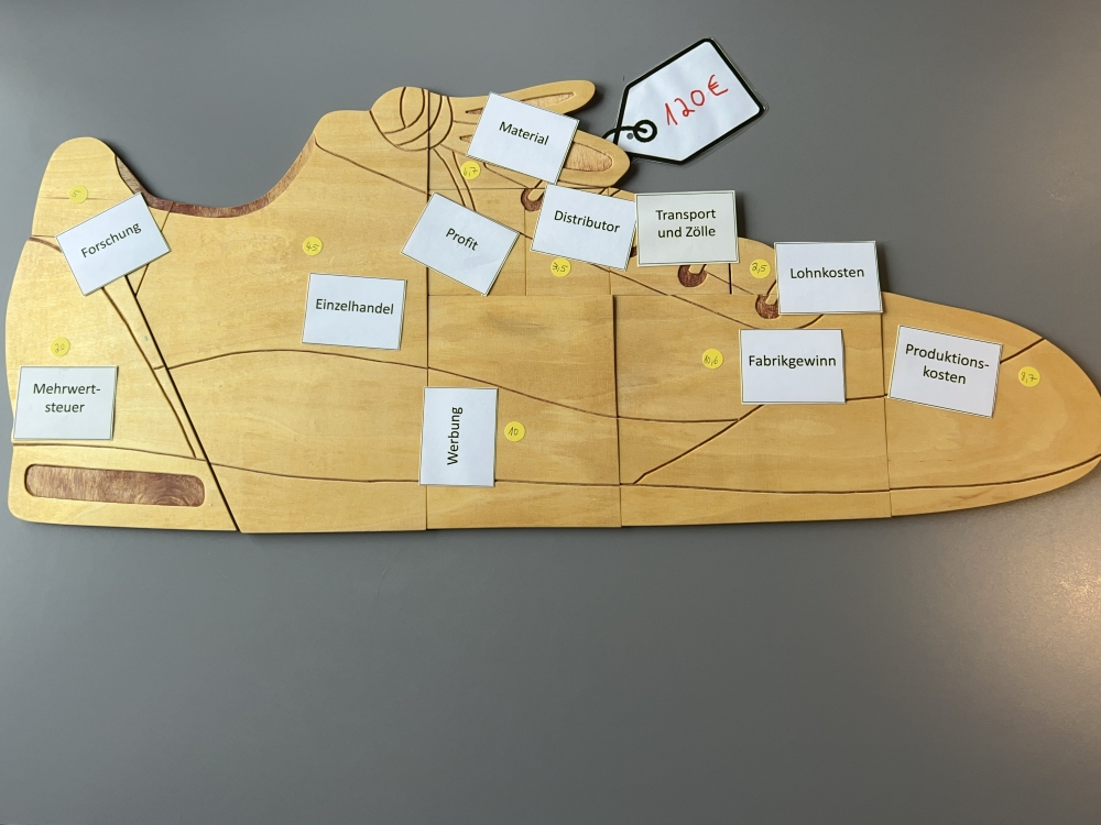 Anschließend beschäftigten sich die Schülerinnen und Schüler mit den Produktionsländern ihrer Schuhe. Dabei lernten sie, in welchen Ländern die meisten Schuhe produziert werden und welche Arbeitsbedingungen dort herrschen. In einem spielerischen Gruppenauftrag wurden die verschiedenen Kostenfaktoren der Schuhproduktion aufgeteilt – von den Materialkosten bis hin zum Gewinn großer Markenunternehmen. So wurde sichtbar, wie wenig Geld letztlich bei den Arbeiterinnen und Arbeitern in den Produktionsländern ankommt.