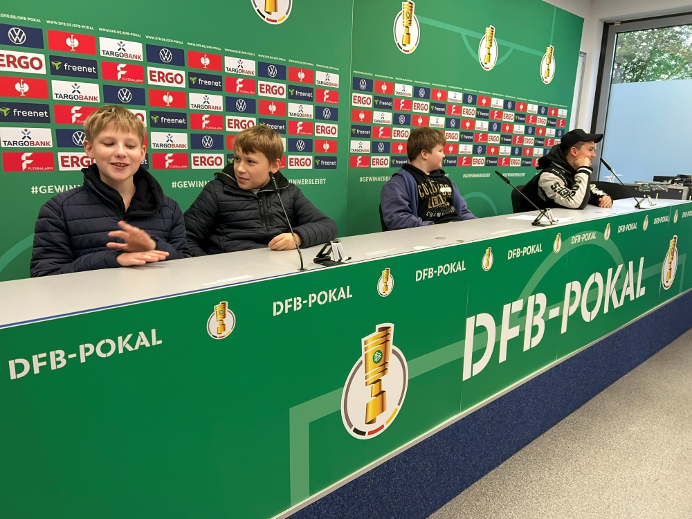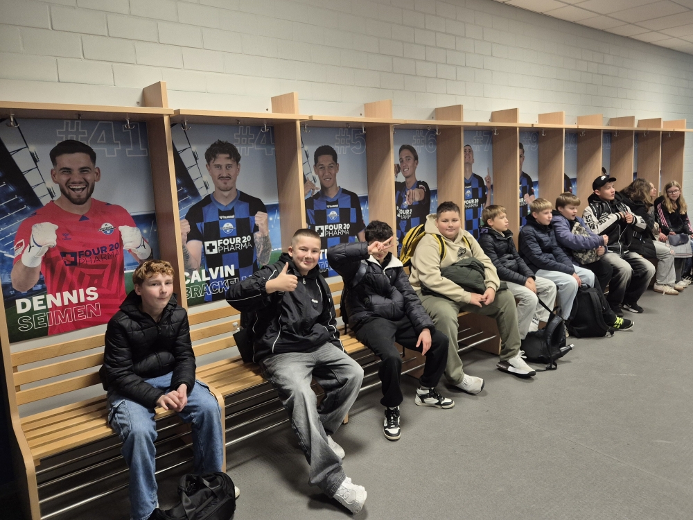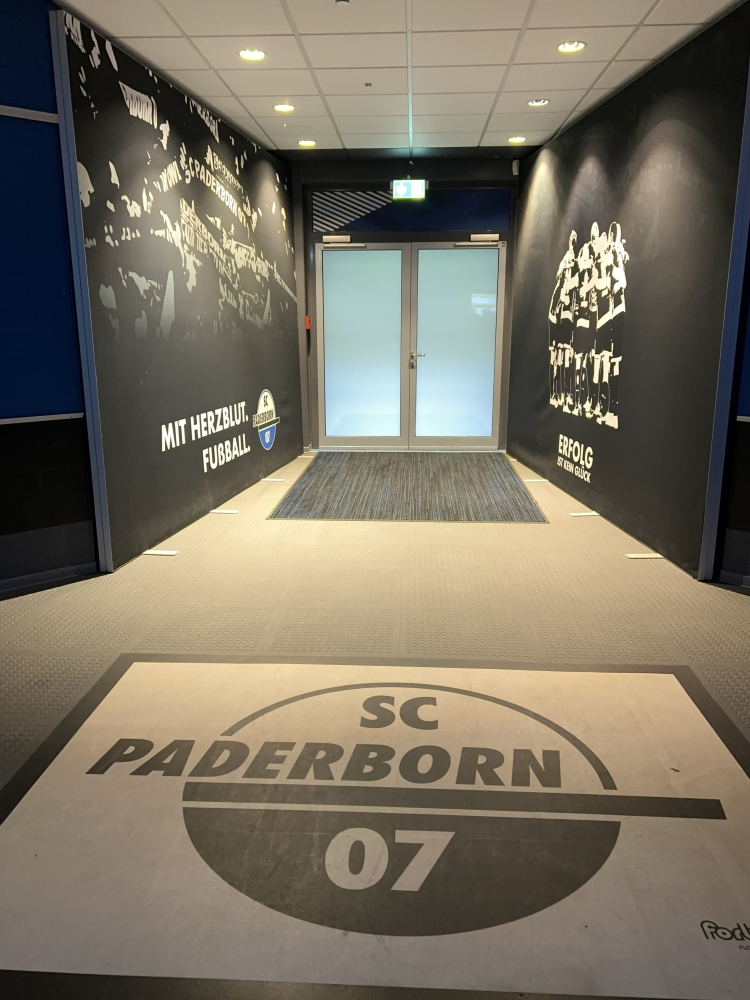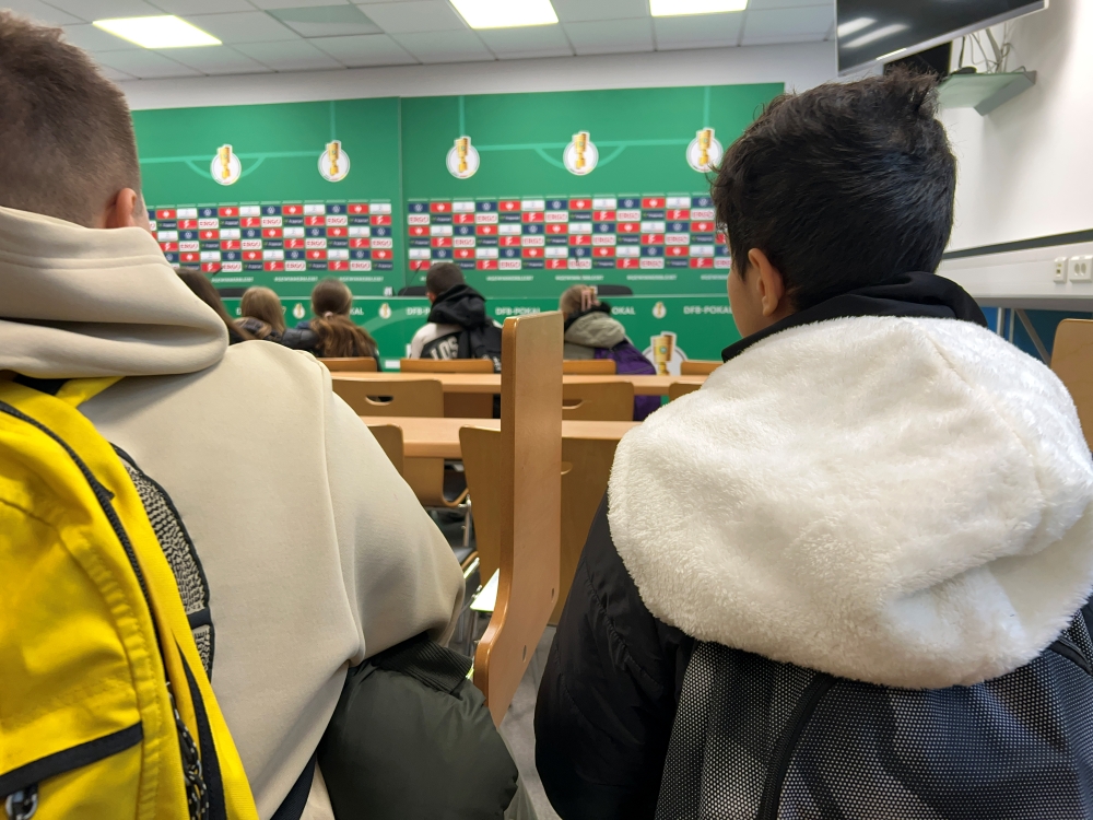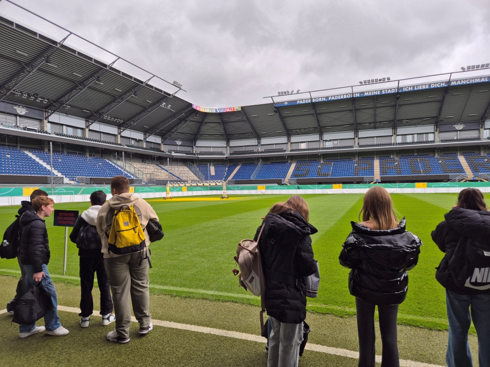 Zum Abschluss des erlebnisreichen Tages erhielten alle eine exklusive Stadionführung. Besonders spannend war der Blick hinter die Kulissen, da im Stadion gerade die Vorbereitungen für das DFB-Pokalspiel am 29. Oktober liefen. Ein besonderes Highlight: Die Klasse durfte vor der offiziellen Pressewand des SC Paderborn Erinnerungsfotos machen.