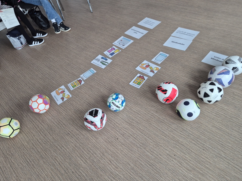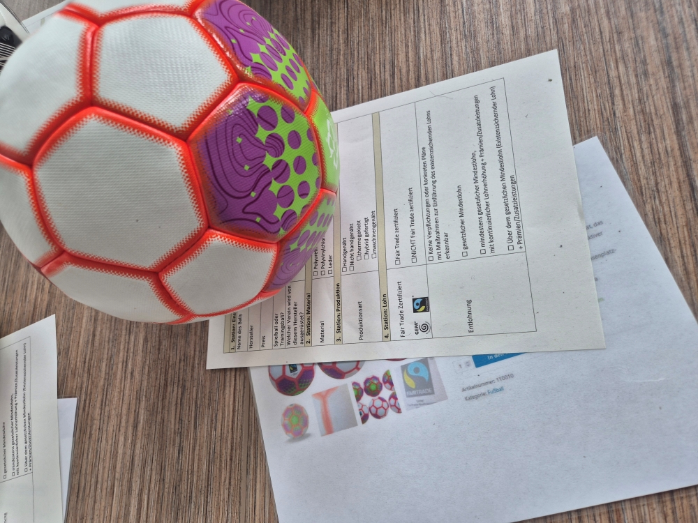 Ein weiterer Programmpunkt war die Produktion von Fußbällen. In Gruppenarbeit recherchierten die Schülerinnen und Schüler verschiedene Bälle – ihren Hersteller, Preis, Verwendungszweck (Trainings- oder Spielball), Material, Produktionsweise (handgenäht oder maschinell gefertigt), Fair-Trade-Zertifizierung und die Entlohnung der Arbeiterinnen und Arbeiter. Dabei kam eine ernüchternde Erkenntnis ans Licht: Die meisten bekannten Fußballvereine arbeiten nicht mit Fair-Trade-Marken zusammen. Immerhin – so lernten die Schülerinnen und Schüler – wird in der Bundesliga mit einem Fair-Trade-Ball gespielt, was zumindest einen kleinen Schritt in Richtung Nachhaltigkeit darstellt.