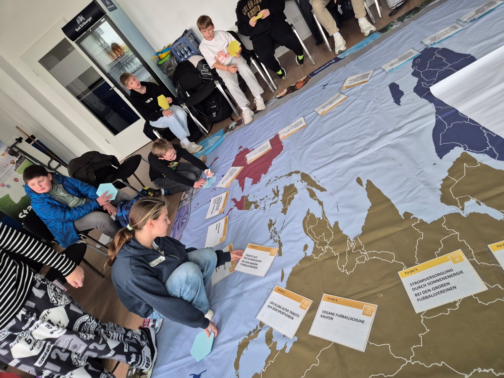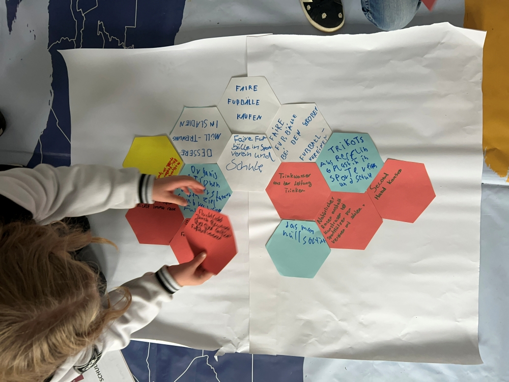 Zum Abschluss überlegte die Klasse, wie im Bereich Fußball zur Erreichung der Nachhaltigkeitsziele beigetragen werden kann – etwa durch Energieeinsparung, faire Sponsoring-Partnerschaften oder eine bessere Mülltrennung in Stadien. Aus den gesammelten Ideen gestaltete die Klasse ihren ganz eigenen „Klassen-Fußball der Nachhaltigkeit“, der die wichtigsten Umsetzungspunkte symbolisch vereinte.